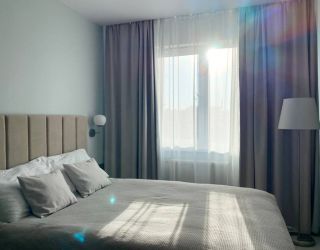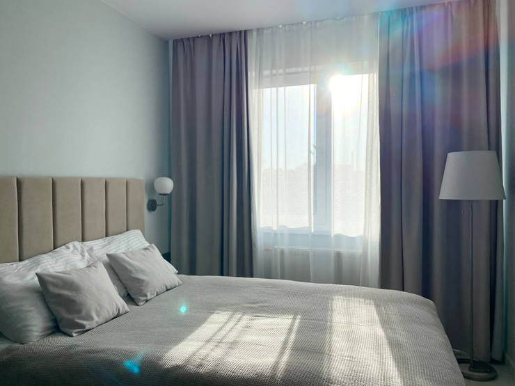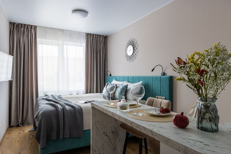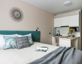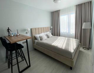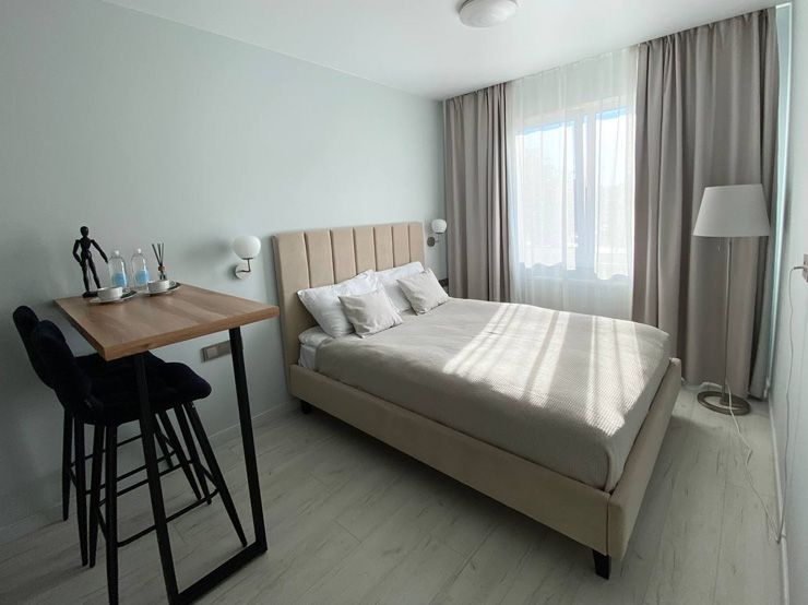 Номерной фонд включает 2 стильные студии, оснащенные всей необходимой для комфортного проживания одного или двух гостей мягкой и корпусной мебелью, бытовой техникой. Жилые зоны укомплектованы двуспальной кроватью, кухонные — рабочим пространством для приготовления еды и барной стойкой. В санузле установлена душевая кабина. Можно подключиться к Wi-Fi.